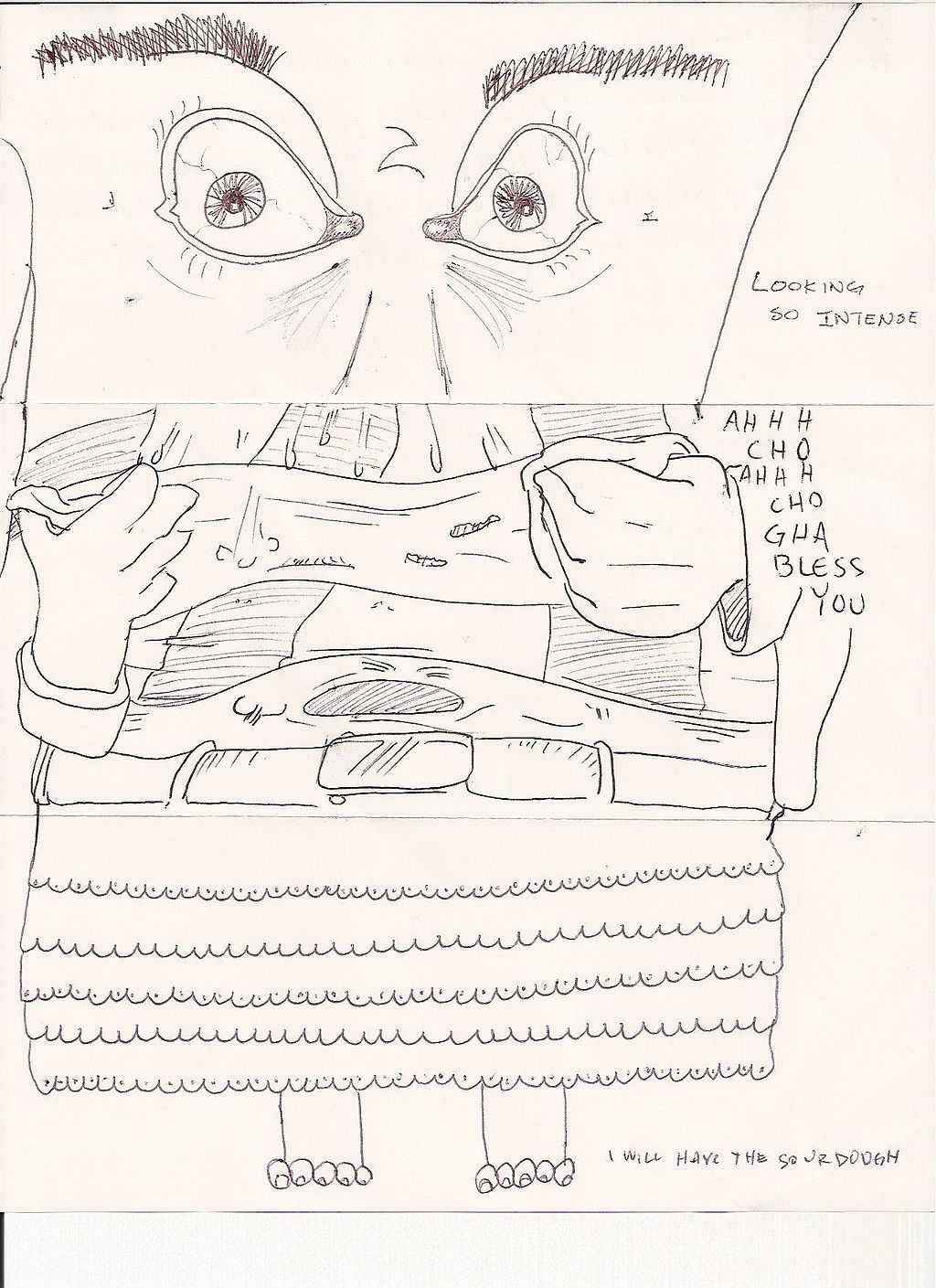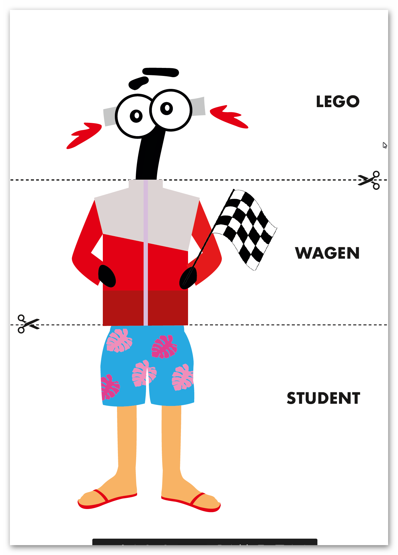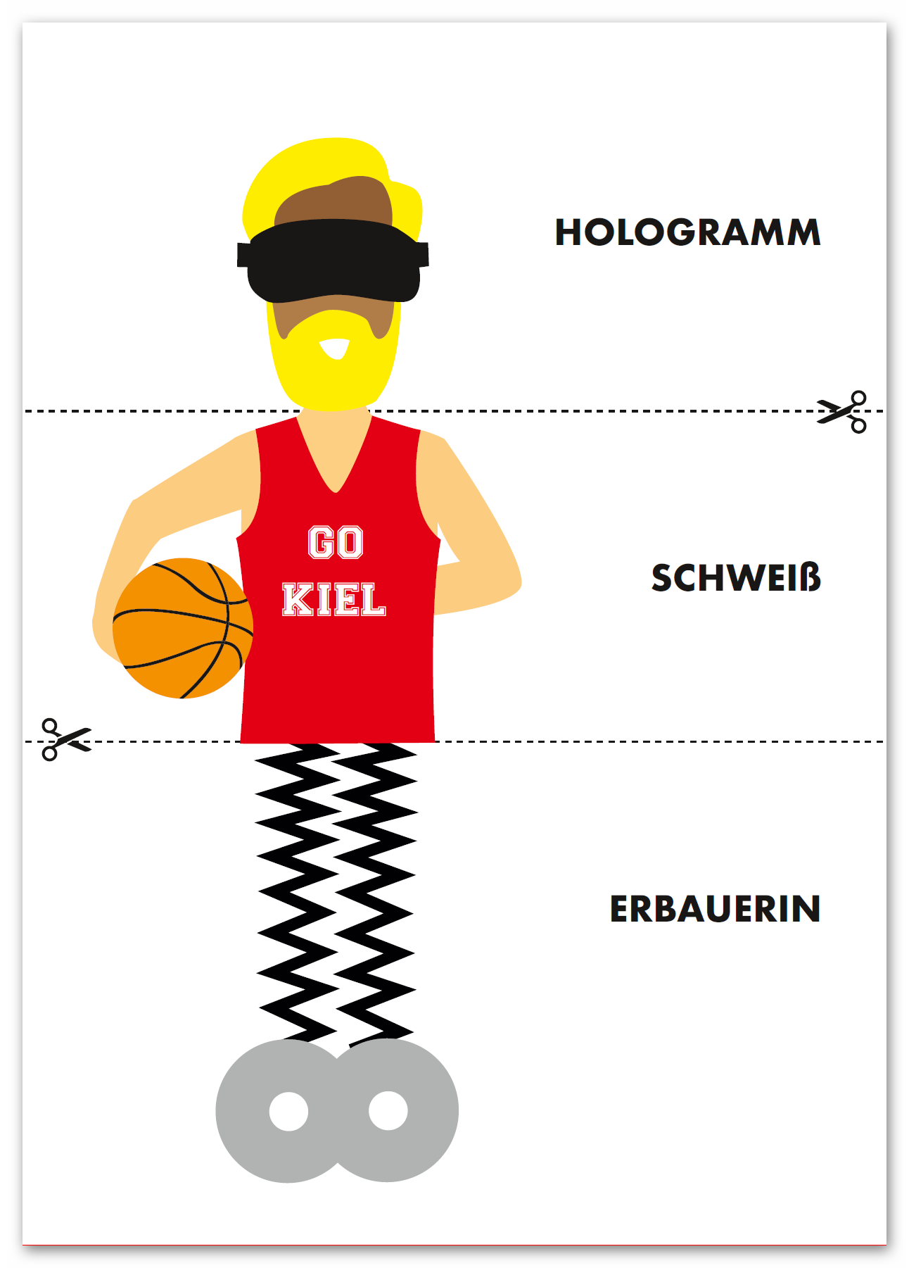 Cadavre Exquis, bei dem eine Figur auf einem umgeknickten Blatt von verschiedenen